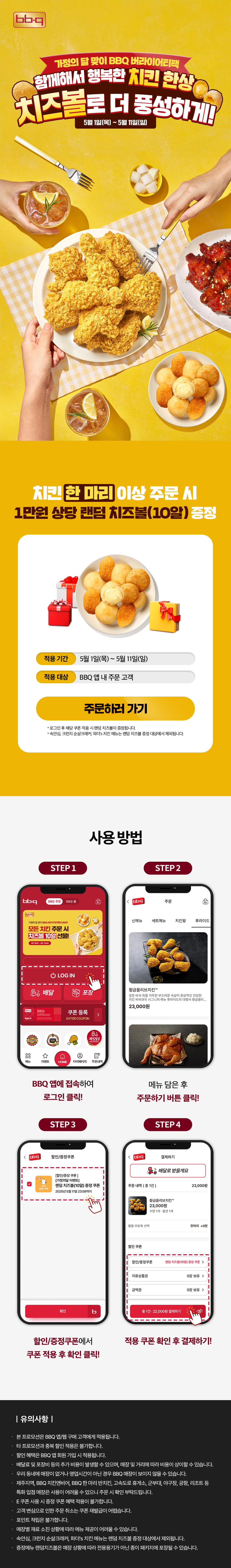 [BBQ] 치킨 1마리만 사도! 1만원어치 치즈볼 무료증정! (~5/11)