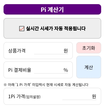 ※ 실시간 시세는 상품가격과 Pi 결제비율만 입력후 계산 버튼을 누르시면 자동으로 시세에 맞게 계산됩니다