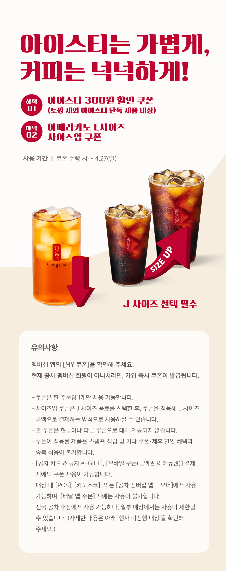 [공차] 3천원 할인 / L사이즈 업 쿠폰 받는 방법! (~4/27)